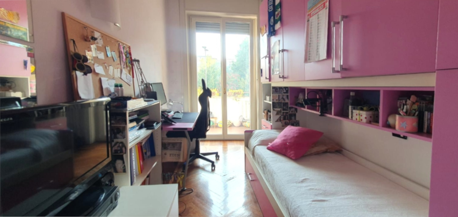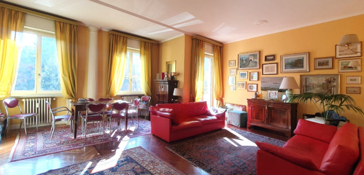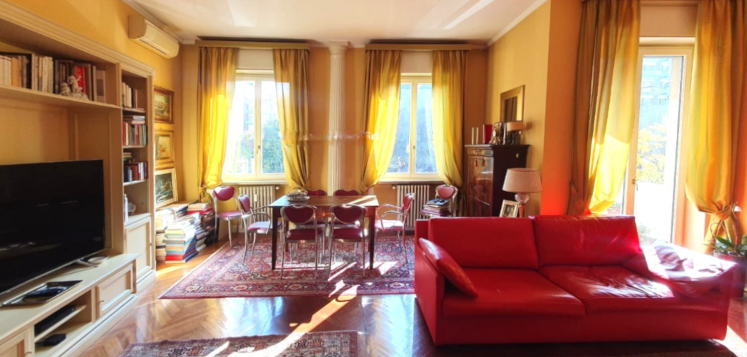 The sleeping area, preceded by functional custom-made furnishings, houses a double bedroom with balcony and en suite windowed bathroom, 2 additional bedrooms, one of which has a balcony, and a second bathroom. Closet. High ceilings and parquet floors give the environment a timeless elegance. The apartment enjoys double exposure and is equipped with air conditioning and central heating. A relevant cellar completes the property. Request € 980,000. Energy class F.