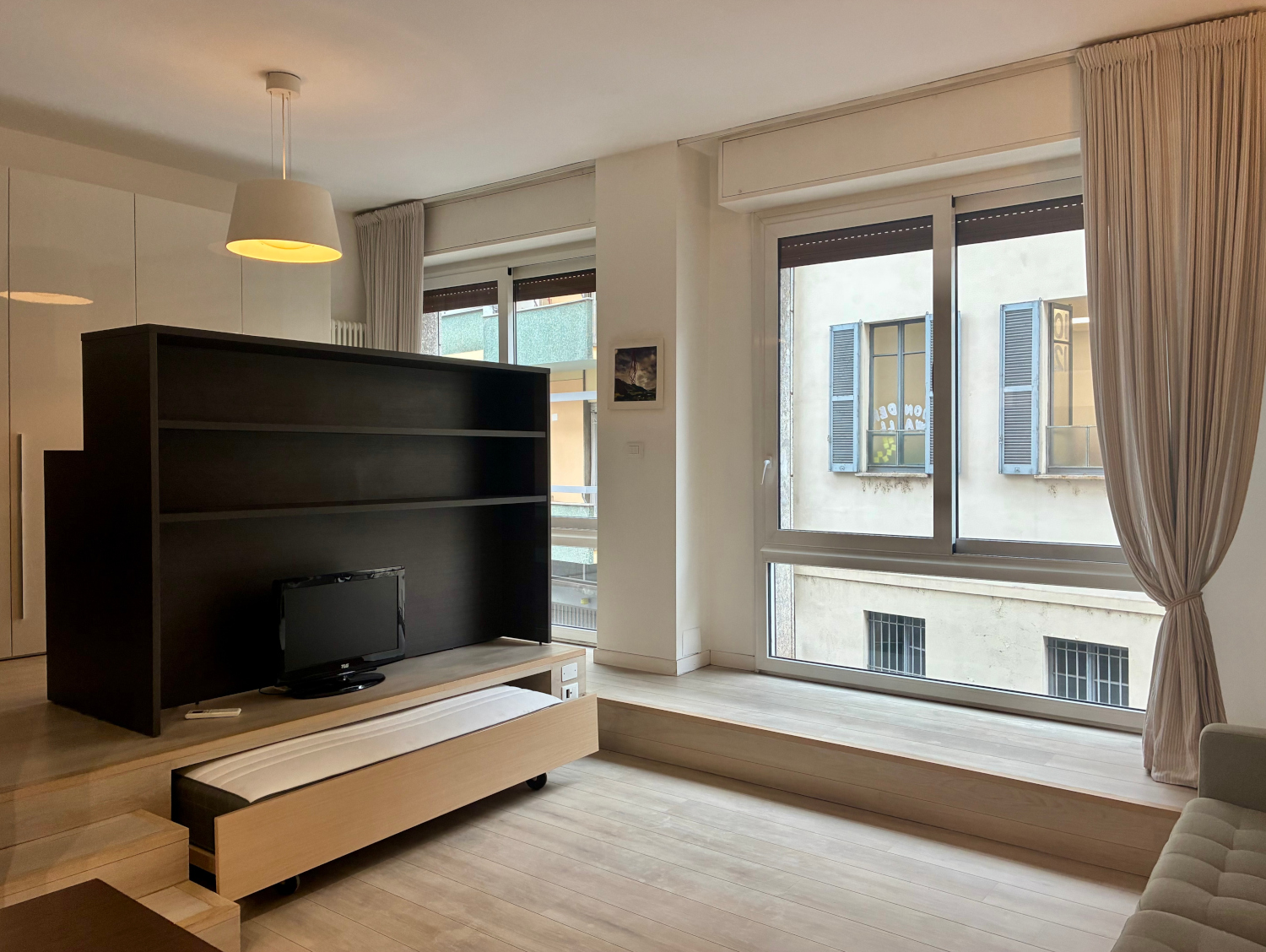 Ad.ze Piazza Vetra. In elegante palazzo con signorili parti comuni e servizio di portineria, luminoso e ampio monolocale, piano 1° mq 50. Ingresso, zona living con grandi vetrate, cucina leggermente rialzata, bagno. Ben arredato. Canone annuo € 18.000 spese incluse (mensili € 1.500) + utenze a parte. Classe energetica G.