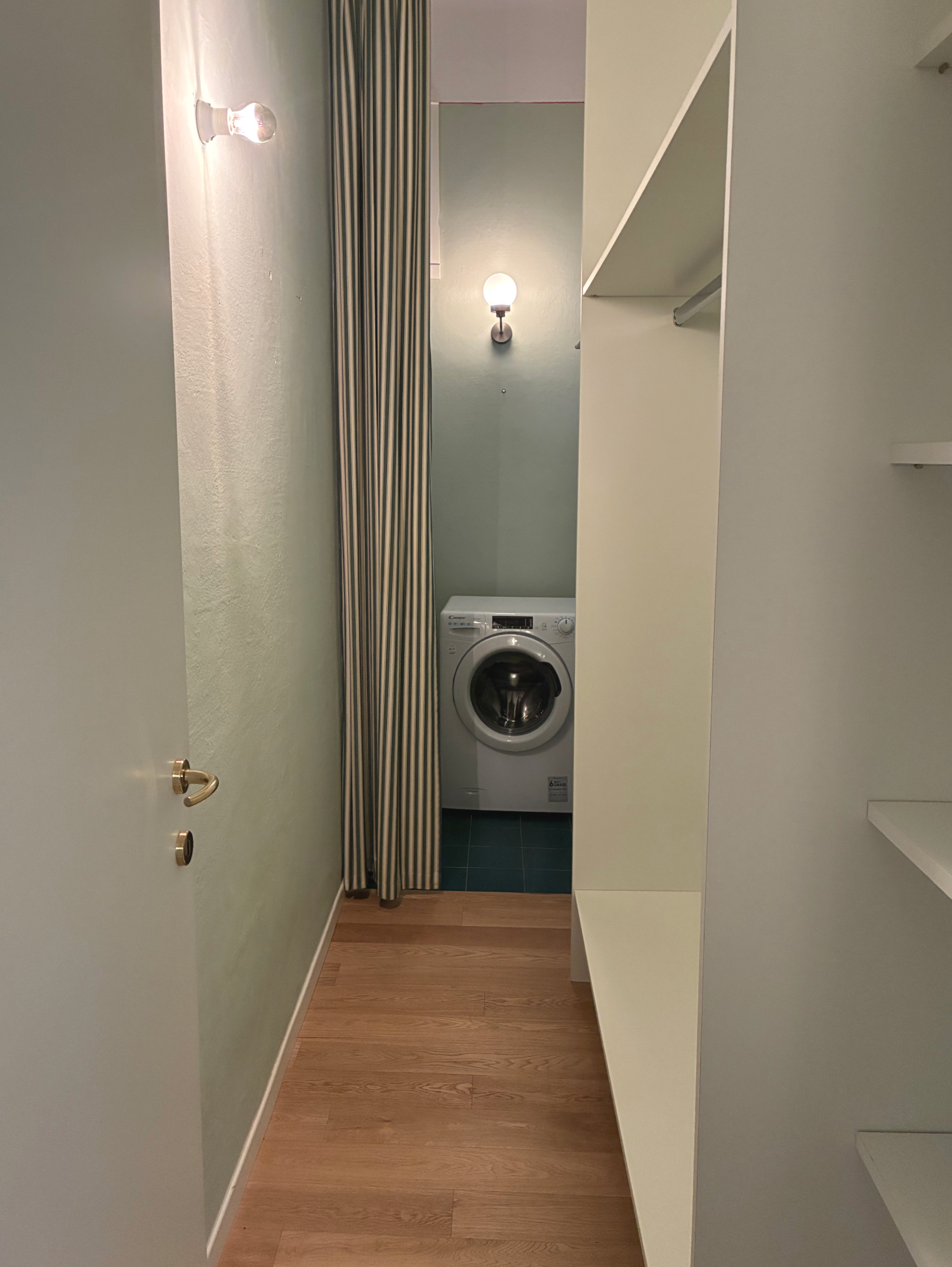 Ingresso con armadi a muro, zona living con ampio e luminoso soggiorno con balcone e cucinotto, zona notte con camera padronale con bagno en suite, locale lavanderia.