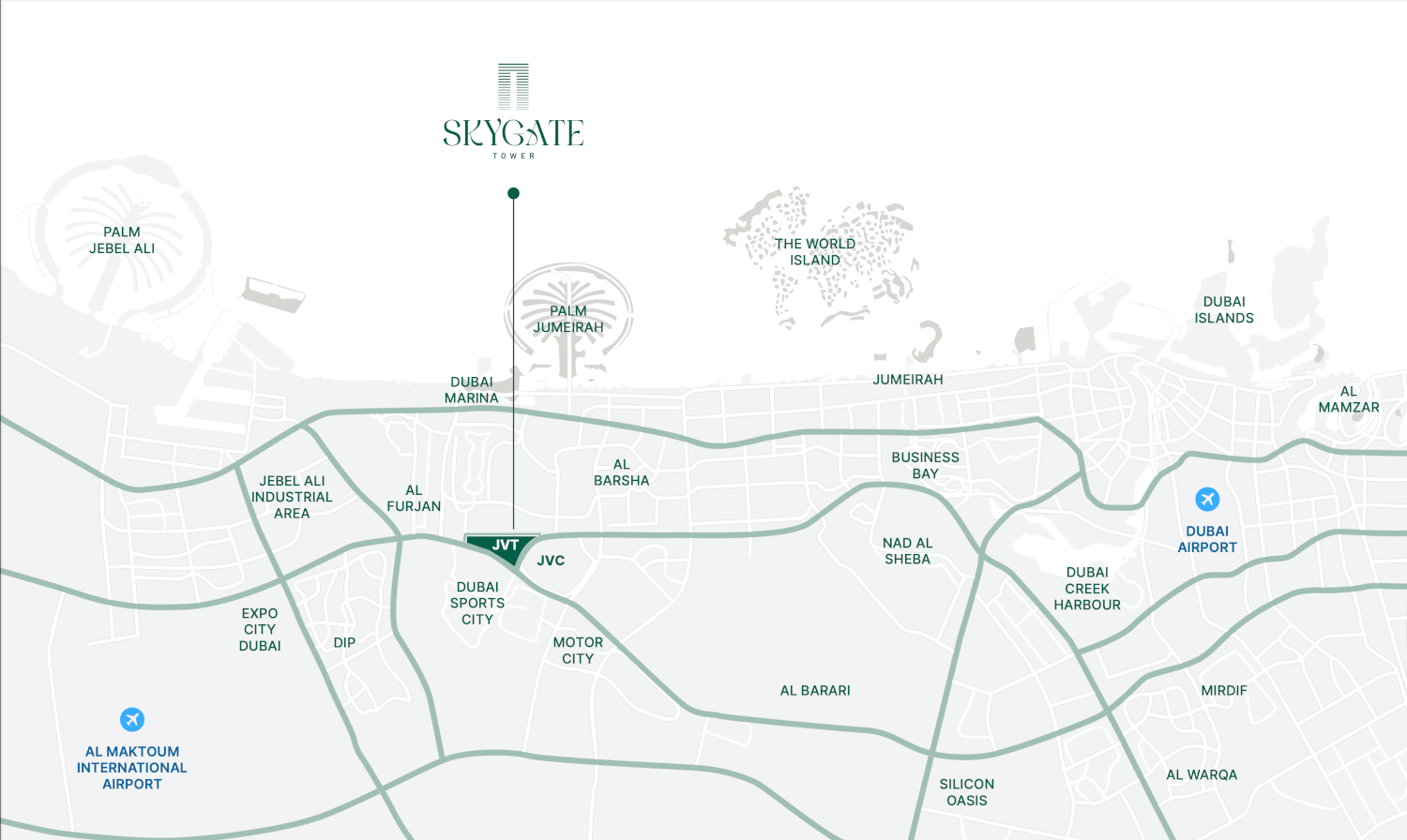 Skygate Tower, firmata Tiger Properties, è una nuova icona architettonica di 43 piani che sorge nell’esclusivo Jumeirah Village Triangle. Un progetto che armonizza design moderno, natura e comfort, creando un’oasi serena perfettamente connessa a Dubai Marina, Downtown Dubai e alle principali arterie della città.